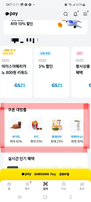 대방출쿠폰을 보시면 지금 버거킹 42%, 롯데리아 23%, 엔젤리너스 30%, 파리파게트 3000원이용권 등등